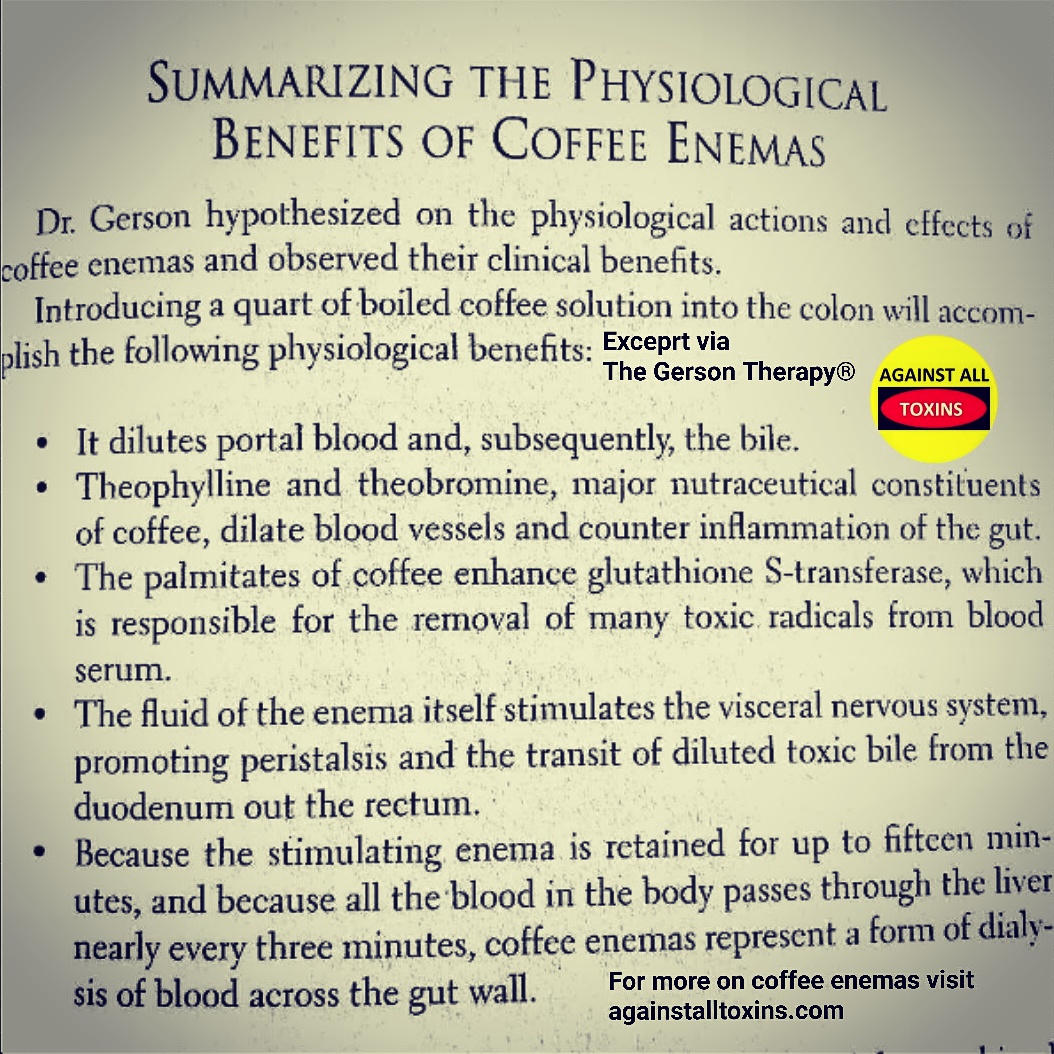 Enemas are nothing new to medicine. In fact, coffee enemas date back to 1500 B.C.. One of the oldest Egyptian medical text, Ebers Papyrus, contained the use of coffee enemas. Evidence was also found in the Dead Sea Scrolls attributing enemas to spiritual purification and in the Merck Manual (practically the medicine bible that all MD’s study) up until the 1970s. Enemas are administered for pain, cancer prevention, liver detoxification, inflammation, constipation etc.